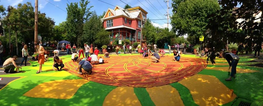 The movement soon expanded to other neighborhoods and larger scales. In 2001, residents created the Sunnyside Piazza at the intersection of Southeast 33rd Avenue and Yamhill Street. They painted a massive sunflower mural directly on the street. They also built permanent amenities on the intersection corners. These included a community information kiosk and trellises. Urban planners and academics study the Sunnyside Piazza today. It serves as a model for how residents can govern their public spaces and build local networks. In 2001, we also launched the Village Building Convergence. This program has supported nearly 1,000 community projects since its creation.